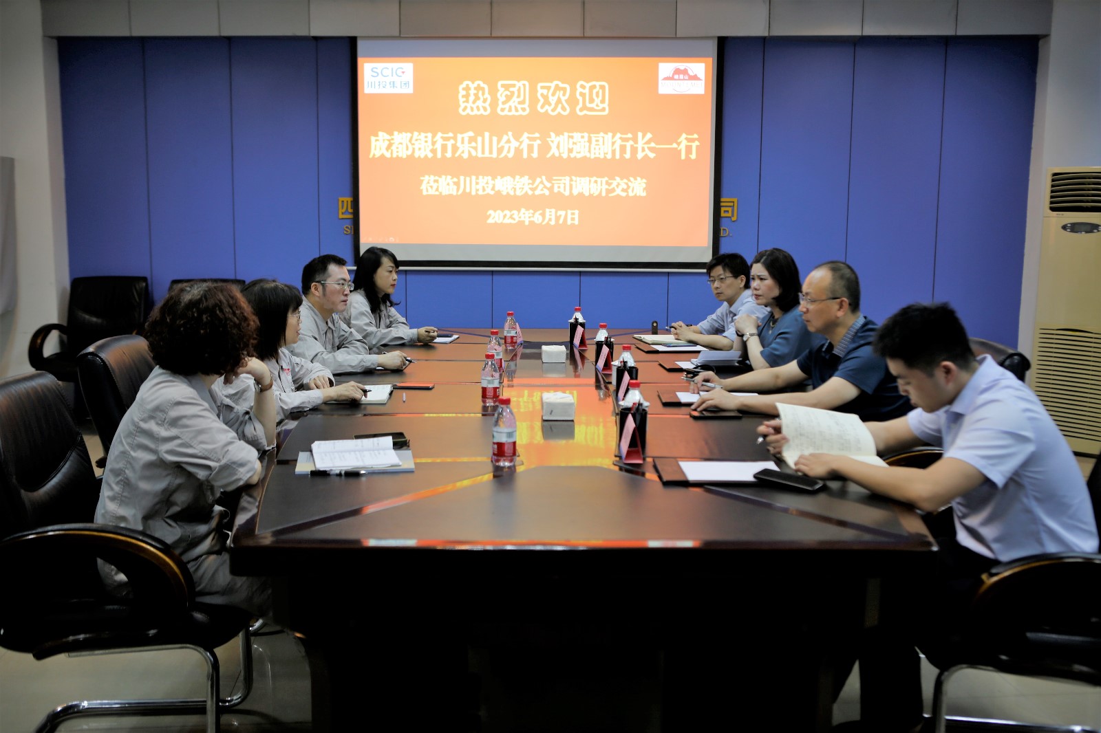 為持續(xù)推進(jìn)銀企互信互助,拓寬公司融資渠道,實(shí)現(xiàn)銀企互利共贏,6月7日,成都銀行樂(lè)山分行副行長(zhǎng)劉強(qiáng)一行4人應(yīng)邀到訪公司,和川投峨鐵公司總會(huì)計(jì)師方玲以及財(cái)務(wù)處相關(guān)人員在908會(huì)議室進(jìn)行了調(diào)研交流。