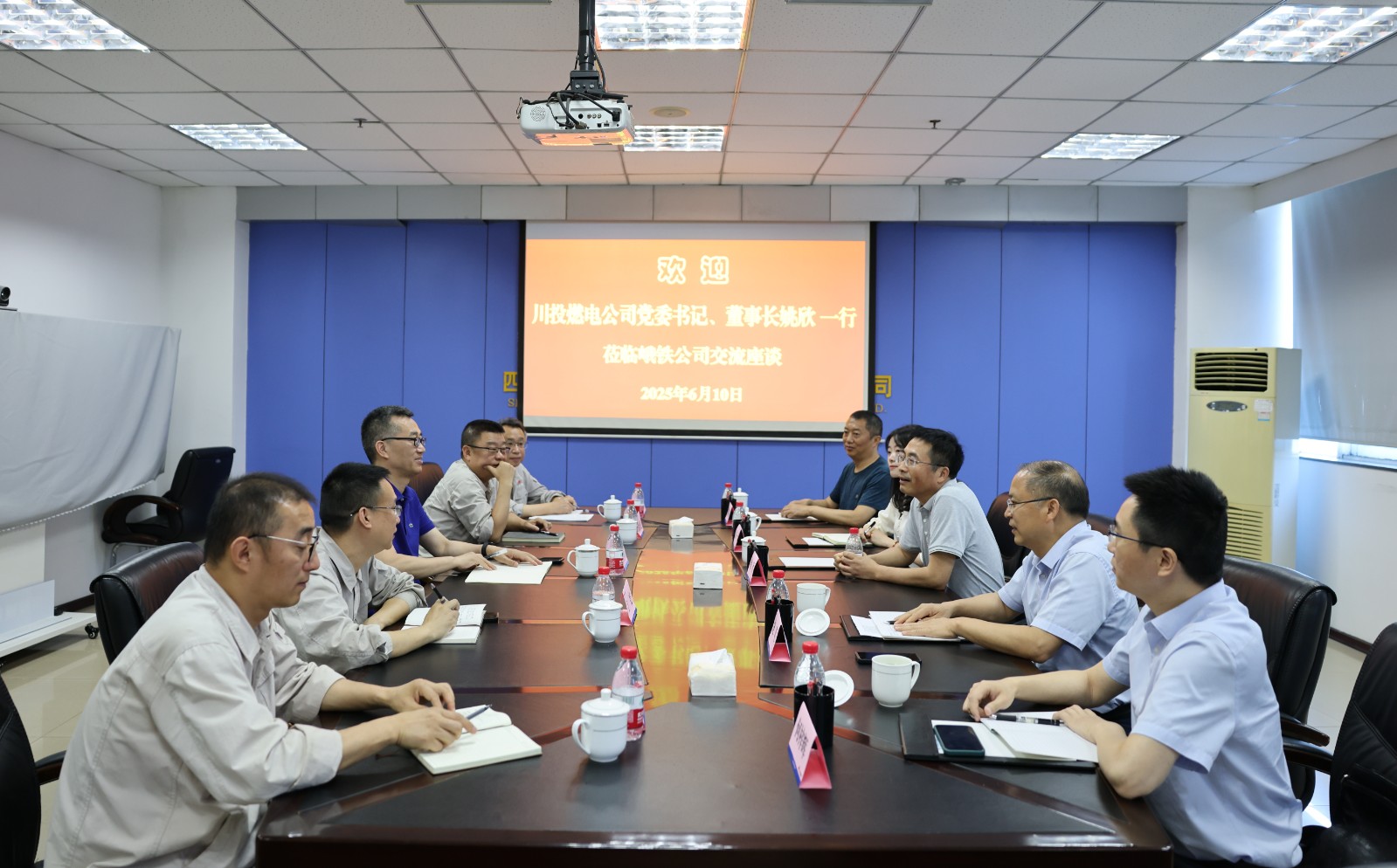 6月10日,四川川投燃?xì)獍l(fā)電集團(tuán)有限責(zé)任公司黨委書記、董事長姚欣一行5人到訪川投峨鐵公司,公司黨委書記、董事長李勝章參加交流座談。