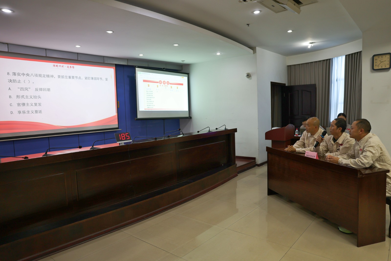 作為沖刺全年目標任務(wù)的動員令,競賽緊扣生產(chǎn)經(jīng)營關(guān)鍵領(lǐng)域設(shè)計題庫,涵蓋中央八項規(guī)定精神、國企領(lǐng)導(dǎo)人員廉潔從業(yè)規(guī)定、黨內(nèi)行為準則規(guī)范等核心內(nèi)容,重點聚焦集團黨委提出的“三個五”具體要求、技改項目招標、物資采購監(jiān)管、安全生產(chǎn)責(zé)任等生產(chǎn)經(jīng)營重點工作設(shè)置考題。來自9個黨支部的代表隊伍同臺競技,以賽促學(xué),經(jīng)過速答、搶答、攻防賽三輪角逐,參賽隊伍均展現(xiàn)出堅定的黨性紀律和的過硬的知識儲備。最終,儲運黨支部、技改項目臨時黨支部和進出口供銷黨支部三隊分別斬獲一、二、三等獎。